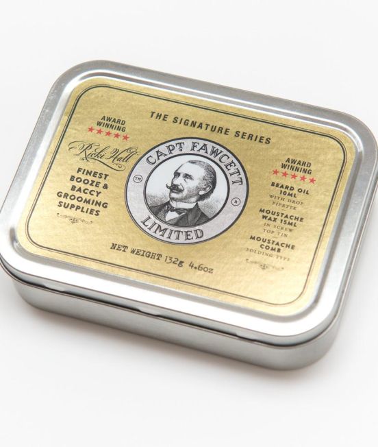 Captain Fawcett is delighted to have collaborated with the World renowned Dandy & Gentleman about town Mr Ricki Hall in assembling this extremely useful ‘Booze & Baccy’ Beard & Moustache survival kit… Cunningly concealed in a 2oz metal tobacco tin you will find Beard Oil, Moustache Wax and a rather splendid Moustache Comb. Whether you are navigating the urban jungles of London or Manchester or for that matter wading waist deep through a Floridian swamp these handy grooming tools are just the ticket, ensuring that you will be looking your most dapper at all times. Carry On.