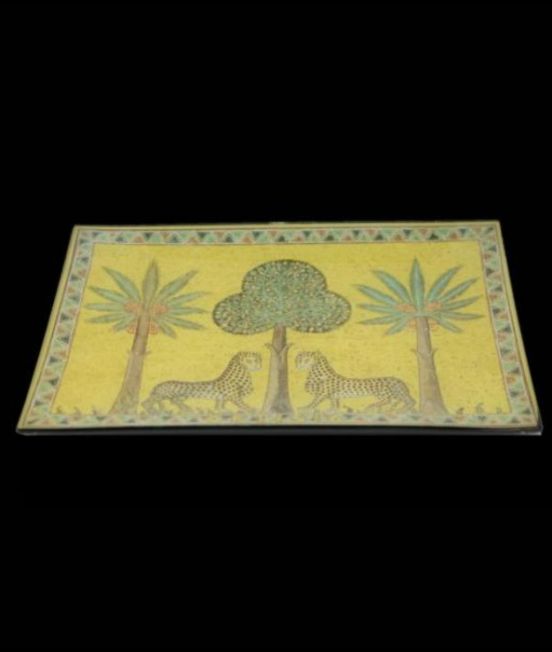 A beautiful rectangular silk screen printed glass plate in yellow decorated with the famous Ortigia Gattoardo/Serval emblem.