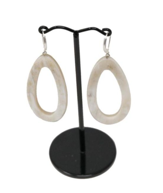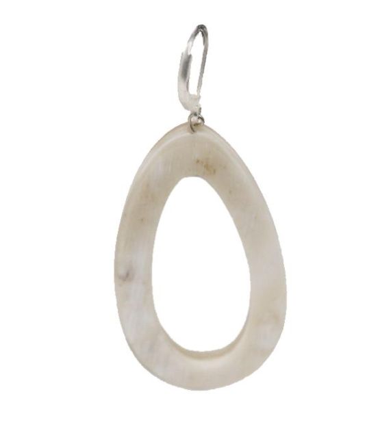 Pale horn hoop earrings carved into something akin to a hollow droplet