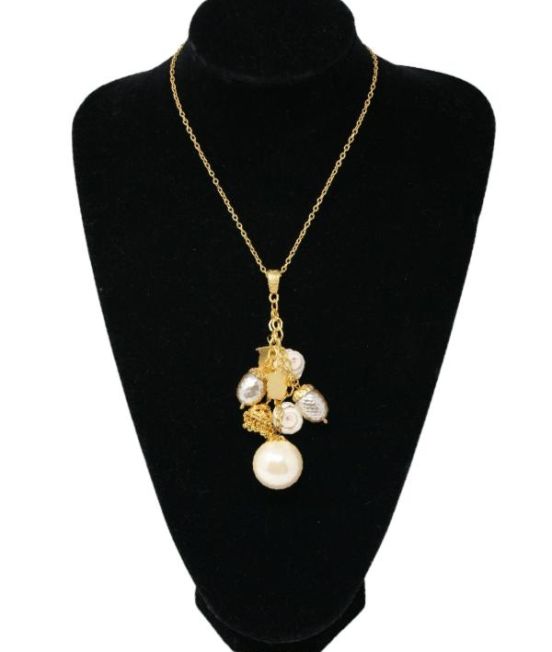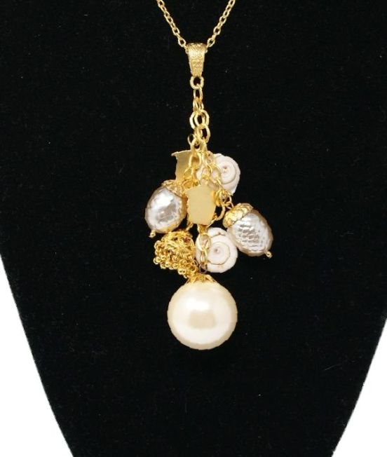 Pearl, shell and brass charm necklace