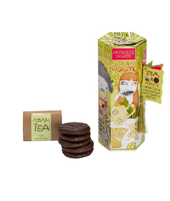 This stunning box decorated with the artist’s original work, includes the perfectly balanced combination of smoky and sophisticated Assam tea with warming ginger and dark chocolate coated biscuits. A unique and remarkable taste experience to share and enjoy with friends and family.