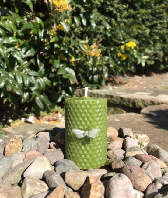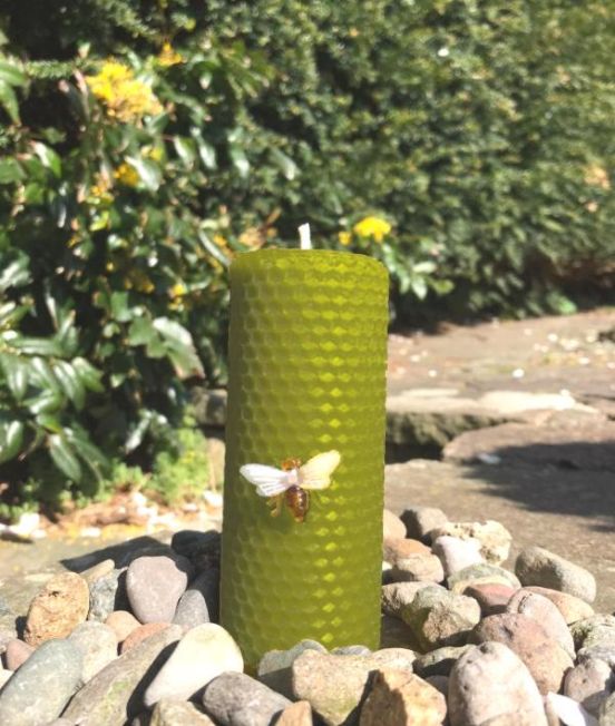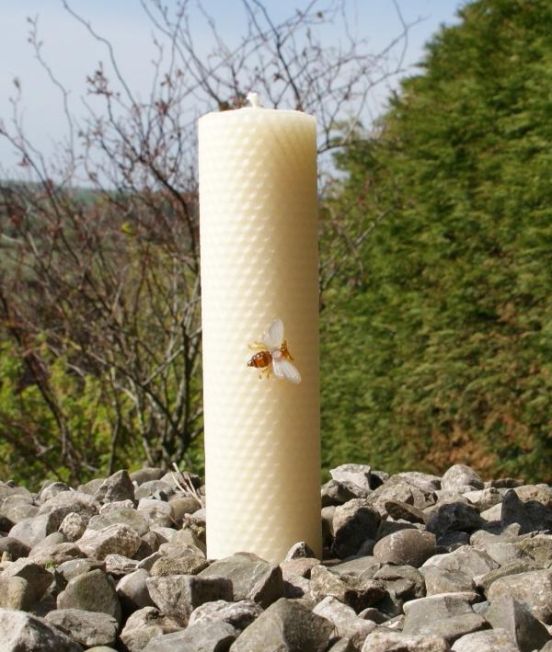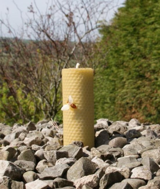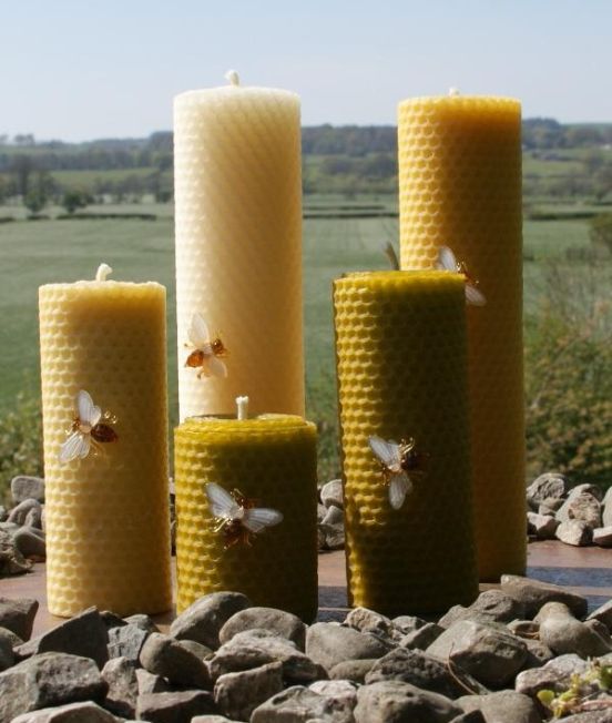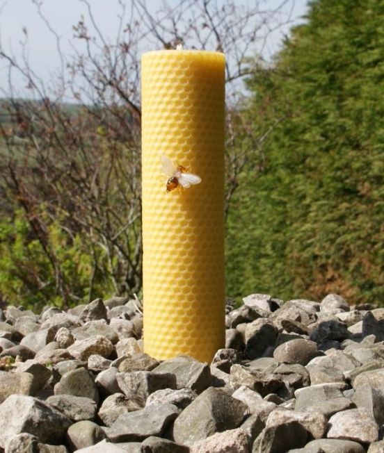 These natural bees wax candles are made by rolling sheets of beeswax into 2 inch columns.