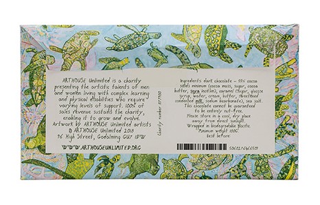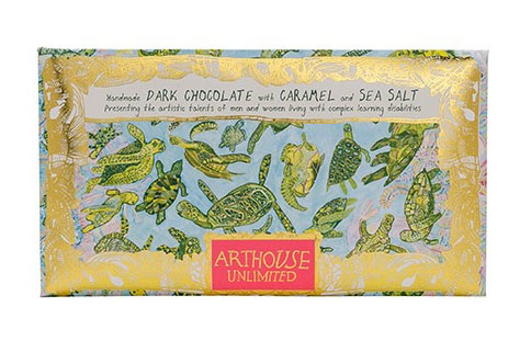 Proudly adorned in a collaborative ARTHOUSE Unlimited design inspired by the ancient beauty of tropical turtles, this handmade dark chocolate is laced with caramel and sea salt pieces.